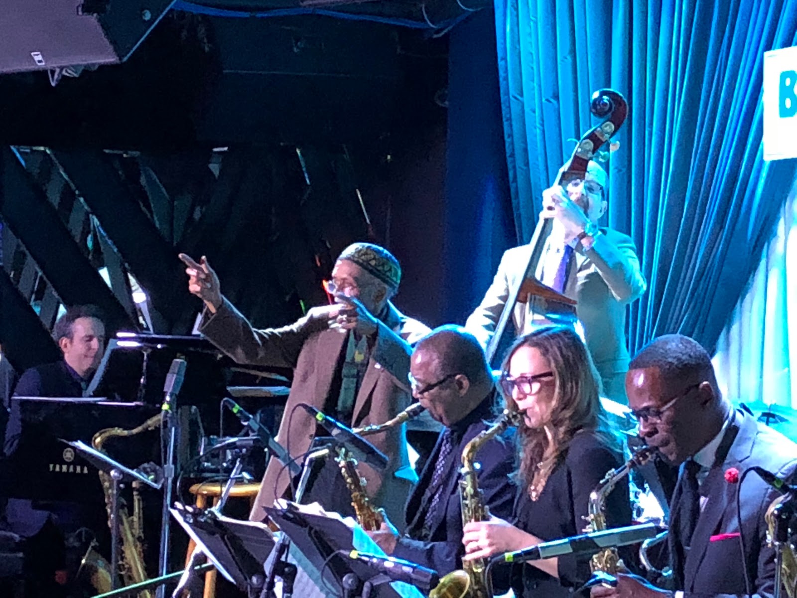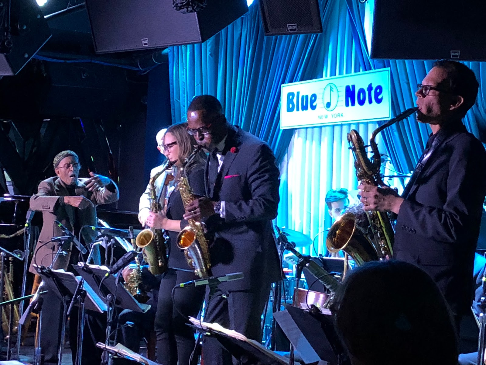 と最終日に話していました。NYの老舗ジャズクラブは階段がつきもの。ブルーノートは控え室が2階にあるので、登ったり降りたりが辛くなって来たそうです。でもステージでは演奏する時は彼は全く座りません。ビッグバンドなので楽器はずーっと演奏するわけではないけれど、ずーっと立ちっぱなしでMCをしたり、両腕を振り上げてコンダクトします。一晩に一時間強のステージを2回です。これはかなり体力いりますよね。